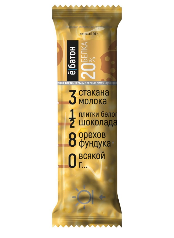 Батончики ™ "Ё батон"20 % протеина со вкусом ПЕЧЕНЬЯ с ЛЕСНЫМ ОРЕХОМ в бел. глазури 40 гр