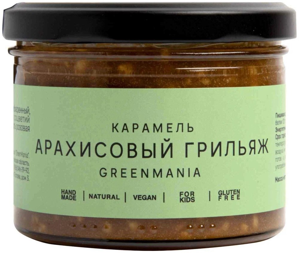 Карамель "Арахисовый грильяж" (peanut caramel) от Greenmania | Гринмания - мягкий и в меру сладкий грильяж на основе цикория, кокоса и арахисового ореха. Прекрасная начинка для круассанов и другой сладкой выпечки, сладкое и полезное дополнение к повседневному рациону для детей и взрослых. Кокос укрепляет иммунитет, оказывает противовоспалительное действие, противостоит распространение патогенных бактерий на слизистых оболочках. Арахис поддерживает здоровье сердца и эластичность сосудов, насыщает витаминами и растительными жирами, улучшает состояние кожи, укрепляет ногти и волосы. Богат антиоксидантами и замедляет старение клеток.