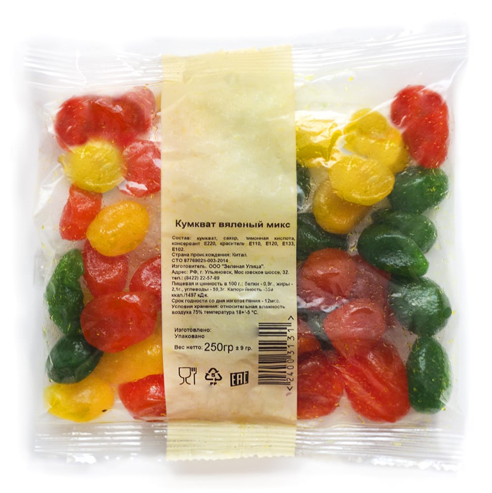 Состав: кумкват, сахар, лимонная кислота, консервант Е220, красители Е110, Е120, Е102, Е133