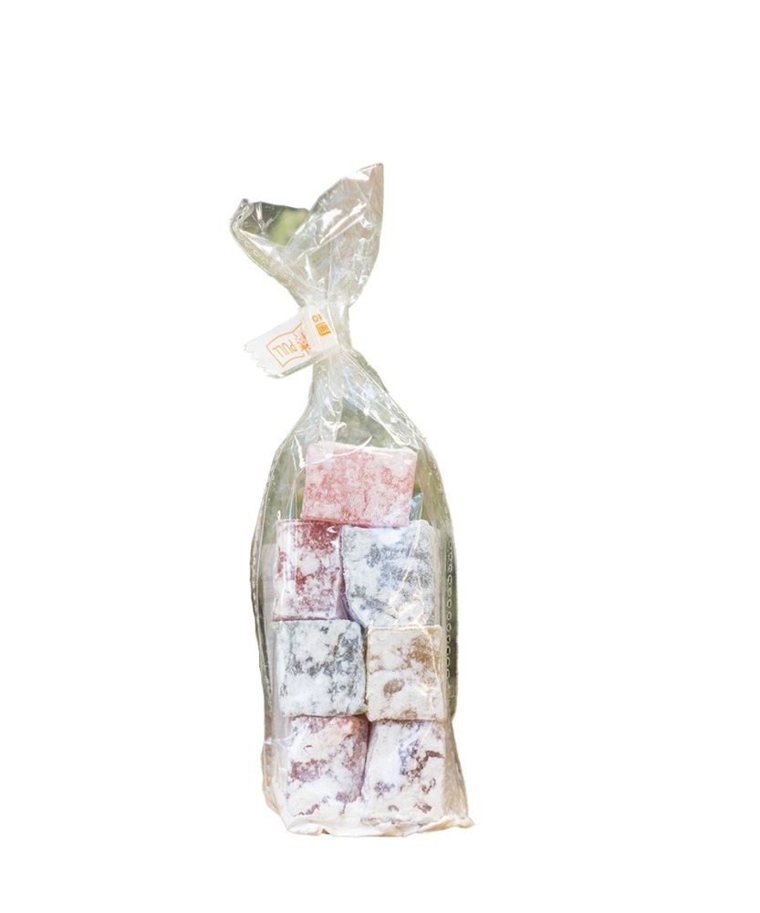Название десерта имеет турецкие корни. В переводе на русский язык слово «рахат» значит «удовольствие», а «лукум» — «небольшие кусочки». Наше лакомство «Радуга» имеет традиционную форму в виде небольших кубиков из плотной желеобразной массы.