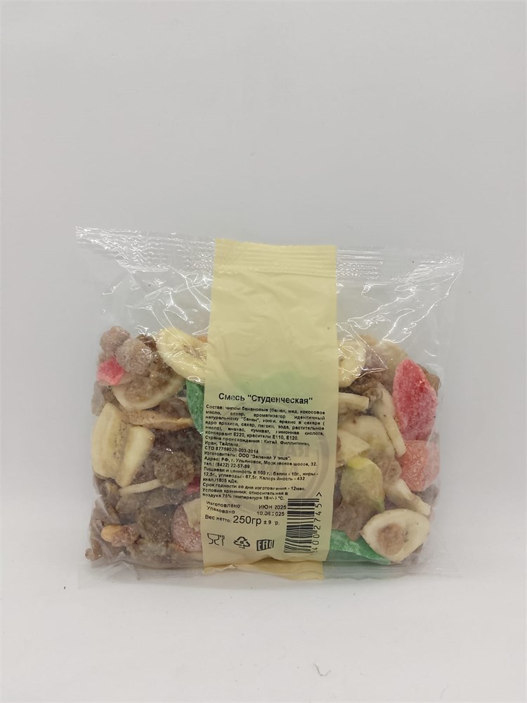 Внутри каждой пачки: чипсы банановые ,изюм ,арахис в сахаре, цукаты ананаса и кумквата . Благодаря проверенным поставщикам, собственной линии фасовки, контролю качества на всех этапах производства мы гарантируем вам приятное удивление от смеси ноток изысканных вкусов и их насыщенности и в будни и в праздники. Наслаждайтесь нашими удобными, полезными снеками в дороге и на работе! Если вы еще не пробовали смесь «Студенческая», то самое время это сделать!