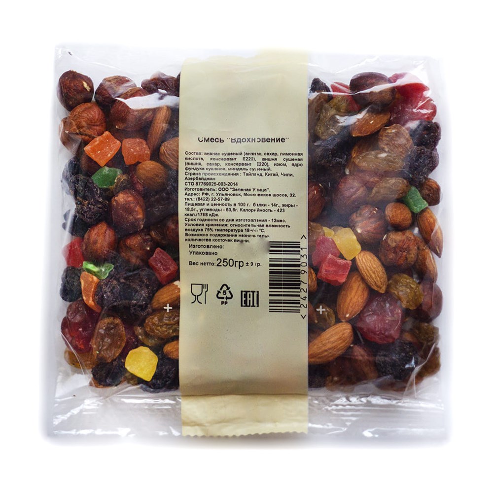 Состав: Ананас кубики, изюм темный, изюм светлый, ядро миндаля сушеное, ядро фундукка сушеное, вишня сушеная
