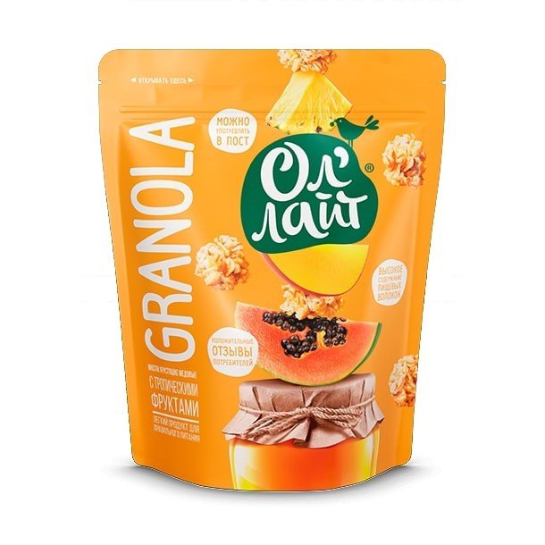 Хрустящая медовая запеченная гранола Ол`Лайт с тропическими фруктами - отличный завтрак для всей семьи! Запеченные злаки содержат клетчатку - растительные пищевые волокна, которые нормализуют работу пищеварительной системы, а в сочетании с тропическими фруктами заряжают организм энергией на весь день! Укрепи свое здоровье цельными злаками и клетчаткой - начни свой день правильно! Отличный завтрак, который можно употреблять с молоком, кефиром, йогуртом, соком или даже в сухом виде в качестве полезного перекуса. Запекается при низких температурах; Высокое содержание пищевых волокон; Можно употреблять в пост; Не содержит ГМО и холестерина.