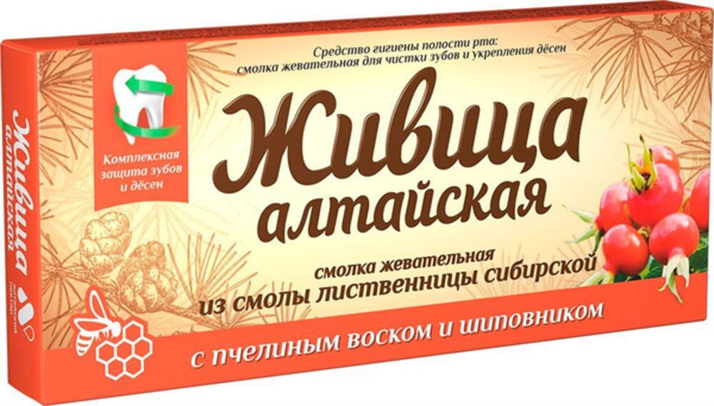 Живица "Алтайская" с пчелиным воском и шиповником - натуральный продукт, природная альтернатива синтетическим жевательным резинкам. В составе отсутствуют полимеры, заменители сахара, искусственные красители, ароматизаторы и усилители вкуса. Живица - ароматное смолистое вещество, выделяющееся при повреждении древесного покрова. Биологически активные вещества живицы обладают антимикробными свойствами, благодаря чему освежают дыхание и санируют полость рта.