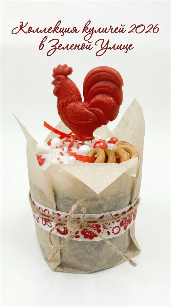 Коллекционный кулич 2026 «Зеленая Улица» — это яркий и праздничный пасхальный десерт в фирменном стиле «Зеленой Улицы». Воздушный кулич покрыт белой кондитерской глазурью, щедро украшен разноцветной сахарной посыпкой, мини-крендельками и увенчан большим синим шоколадным петушком — символом коллекции 2026 года.