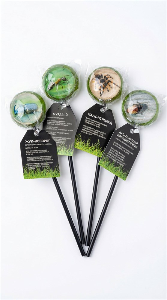 Леденцы в форме полусферы с красивыми насекомымисозданные для истинных любителей необычных лакомств. Эти леденцы идеально подойдут для украшения торта на детском празднике или просто для того, чтобы порадовать своих близких оригинальными сладостями.