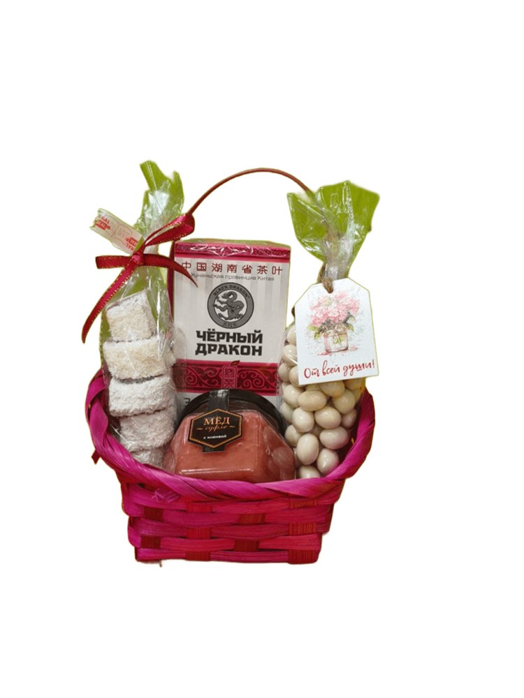 Состав: Чай ™ "Черный дракон" Зелёный шиповник пакет 2г*25п Арахис в белой глазури 100 гр ( мешочек) Рахат-лукум Лакомка "Рулет "100 гр " Мед-суфле ™ "Мусихин. Мир меда" с клюквой 150 гр Корзина подарочная мини Состав подарочного набора может меняться на ваш выбор. Вы можете создать свой эксклюзивный подарок , а мы вам в этом поможем.