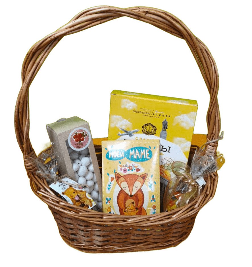 Состав: Корзина подарочная средняя Зефир ™ "SIMBIRSK atelier" "Виды Ульяновска" бананово - клубничный в молочном шоколаде, 165 гр Клюква в сахарной пудре 205 гр Чай пирамидка ™ Chokocat Моей маме 50 гр Арахис в молочной глазури 110 гр ( мешочек) Смесь "Десертная " 100гр ( мешочек)