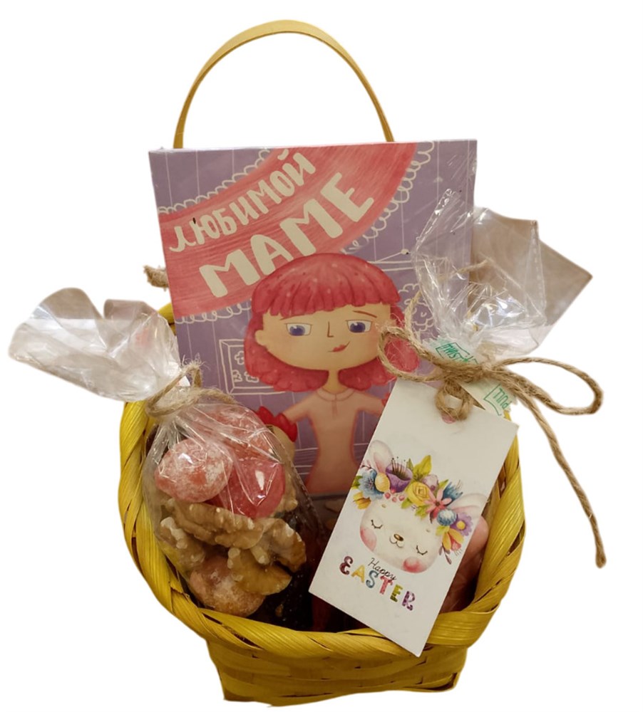 Состав: Корзинка подарочная МИНИ Чай пирамидка " " Chokocat " ЛЮБИМОЙ МАМЕ . 50 гр Смесь " Бразильская" 120 гр. ( мешочек) Грецкий орех " Малина" в йогуртовой глазури с сублимированной малиной 110 гр ( мешочек) Пакет прозрачный с донной складкой