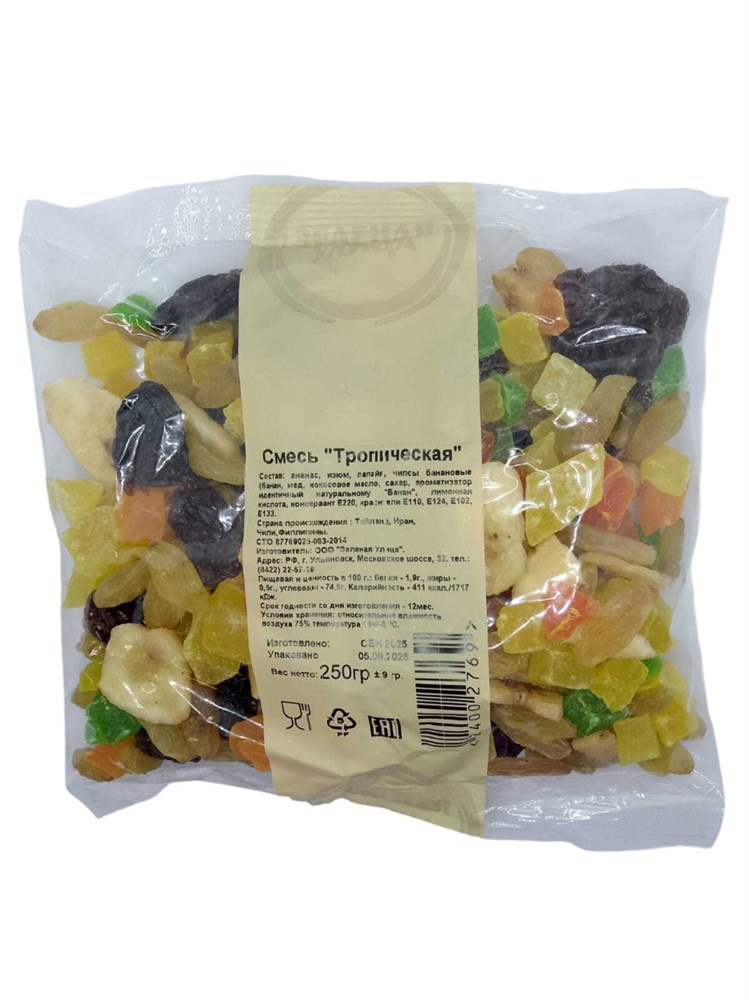 Состав: ананас, изюм, папайя, чипсы банановые ( банан, мед, кокосовое масло, сахар, ароматизатор идентичный натуральному "Банан", лимонная кислота, консервант Е220, красители Е110, Е124, Е102, Е133.