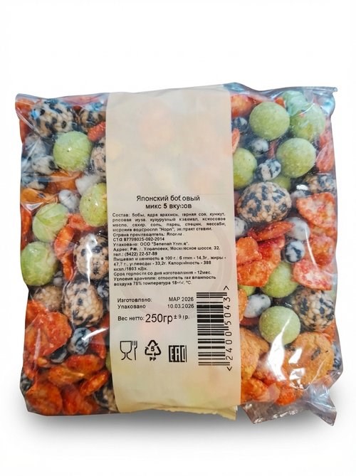 Состав : бобы, ядра арахиса,черная соя, кунжут, рисовая мука, кукурузный крахмал, кокосовое масло, сахар, соль, перец, специи,вассаби, морские водоросли "Нори", экстракт стевии. Пищевая ценность (на 100 г): углеводы - 33,2 г., белки - 14,3 г., жиры - 47,7 г. Энергетическая ценность (на 100 г) : 398 ккал. Срок годности: 12 месяцев. Условия хранения: относительная влажность воздуха 75% температура 18+/-5С